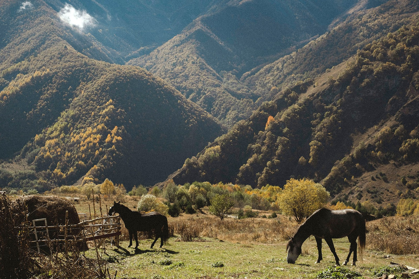 The color of the film is the warm reality of Ossetia: the ochre of the grass, the blue shadows of the mountains, the milk of the fog. Living tones that a digital camera cannot replicate.